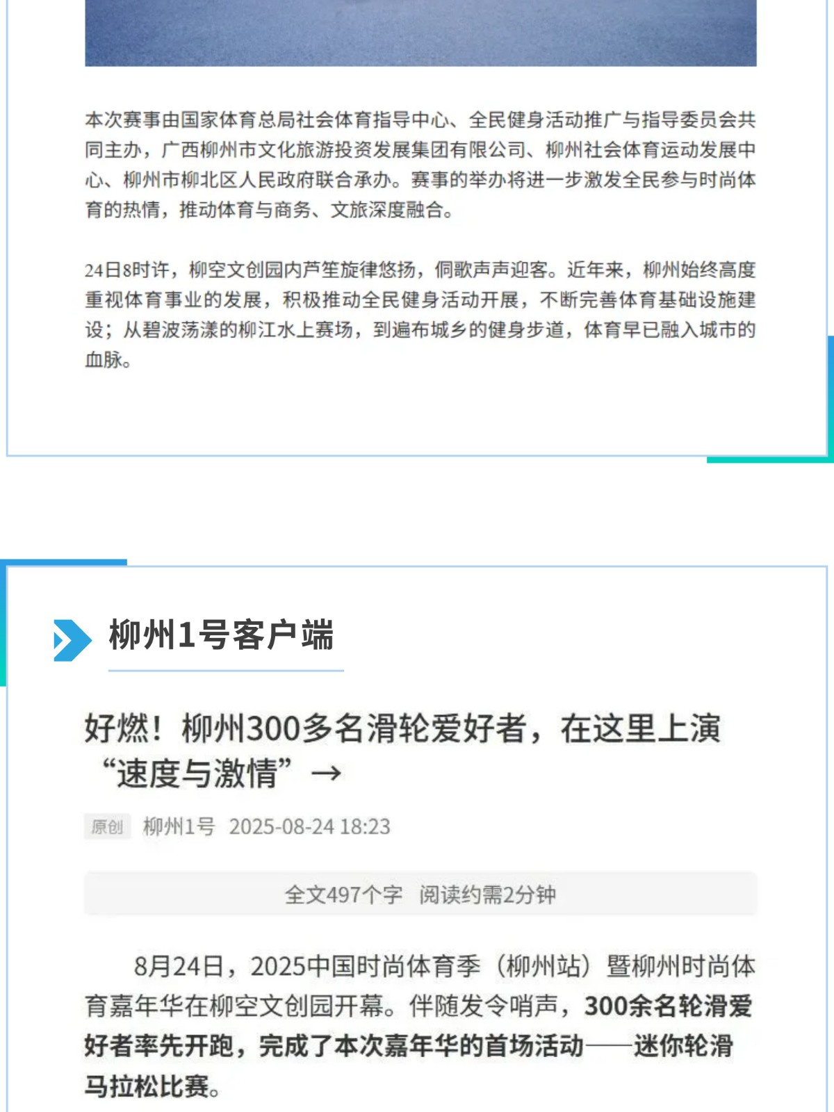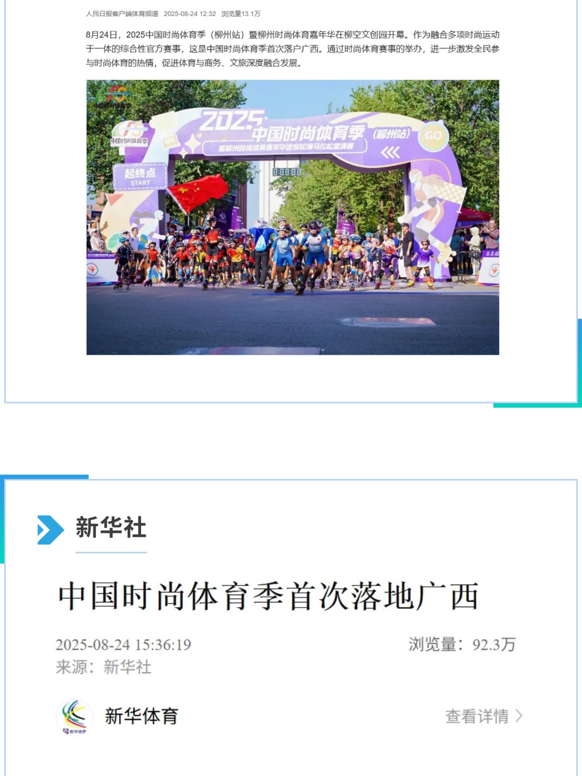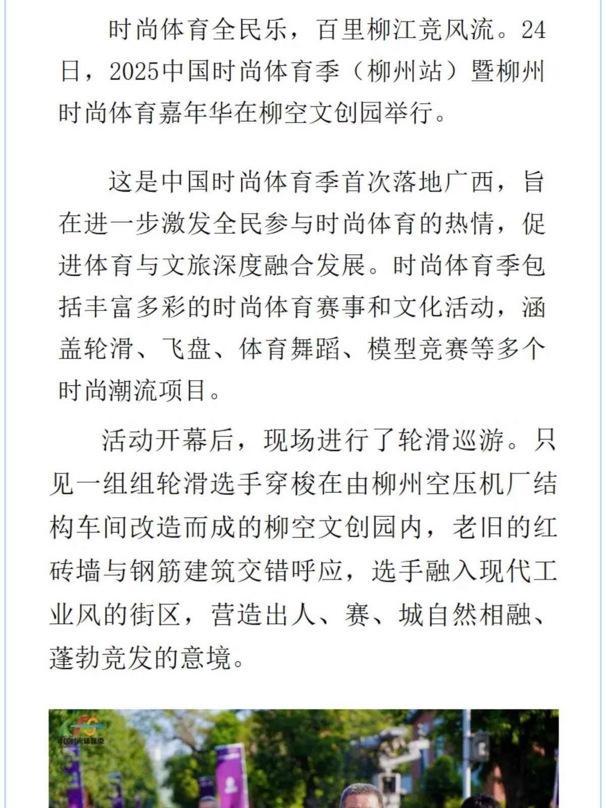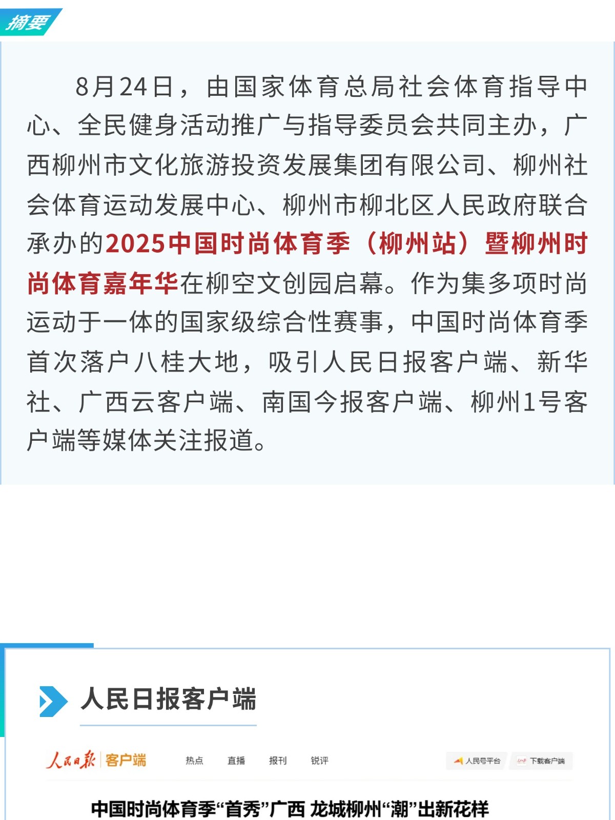 多家媒體關(guān)注:2025中國時尚體育季(柳州站)在柳空文創(chuàng)園啟動 發(fā)布時間:2025年08月29日 17時來源:本站原創(chuàng)瀏覽:286 人次