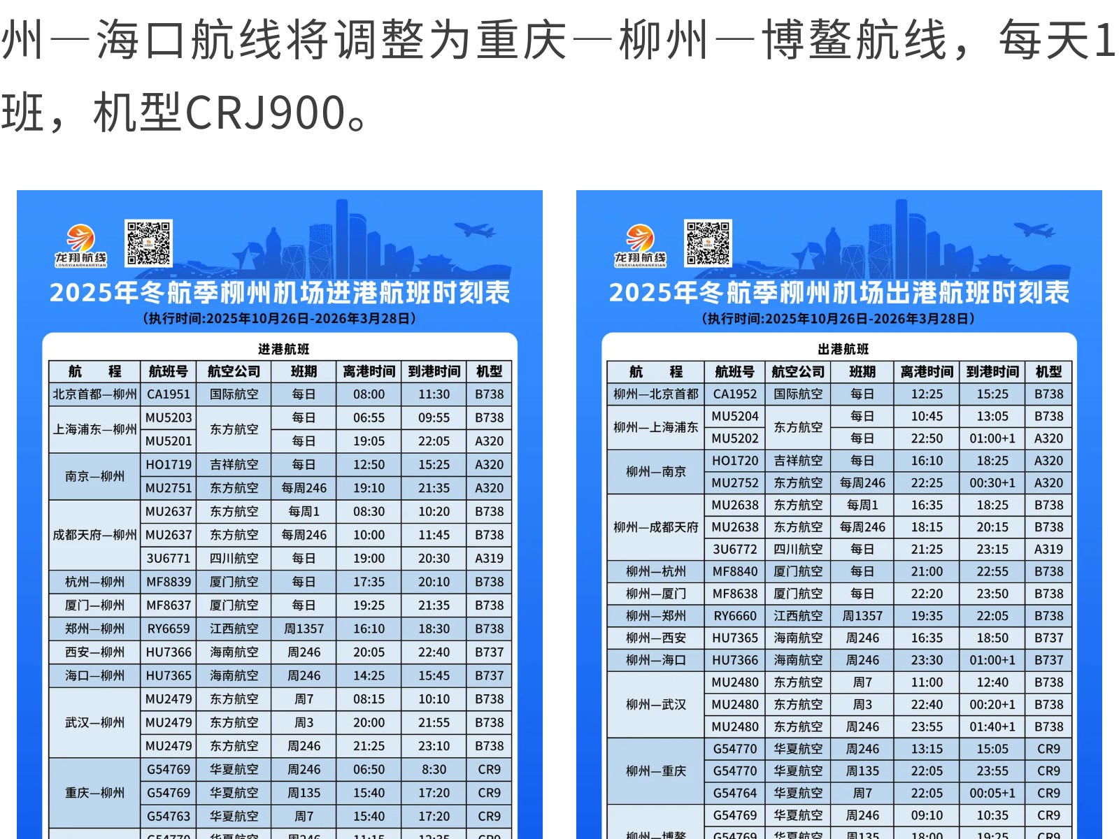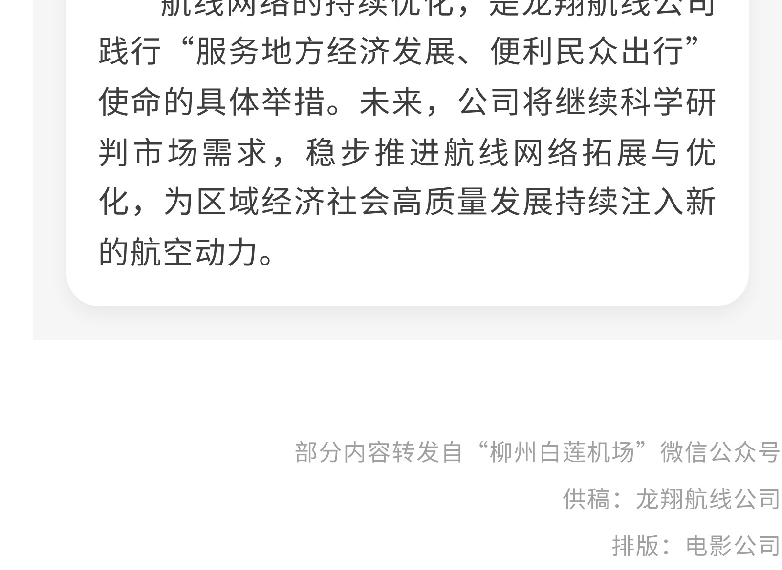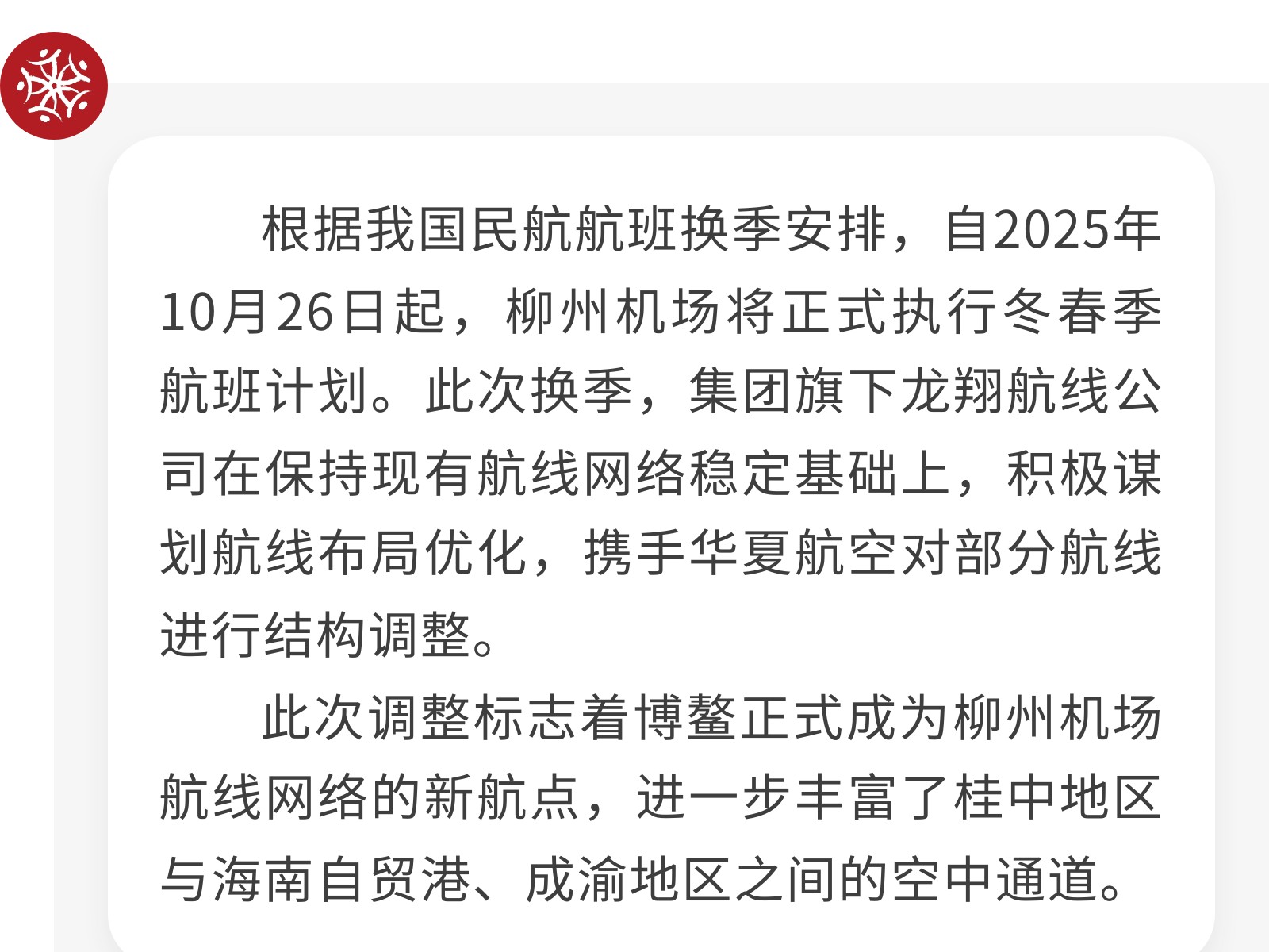 柳州又新增一航點(diǎn)!集團(tuán)旗下龍翔航線公司冬春航季持續(xù)織密航線網(wǎng)絡(luò) 發(fā)布時(shí)間:2025年10月17日 10時(shí)來(lái)源:本站原創(chuàng)瀏覽:69 人次