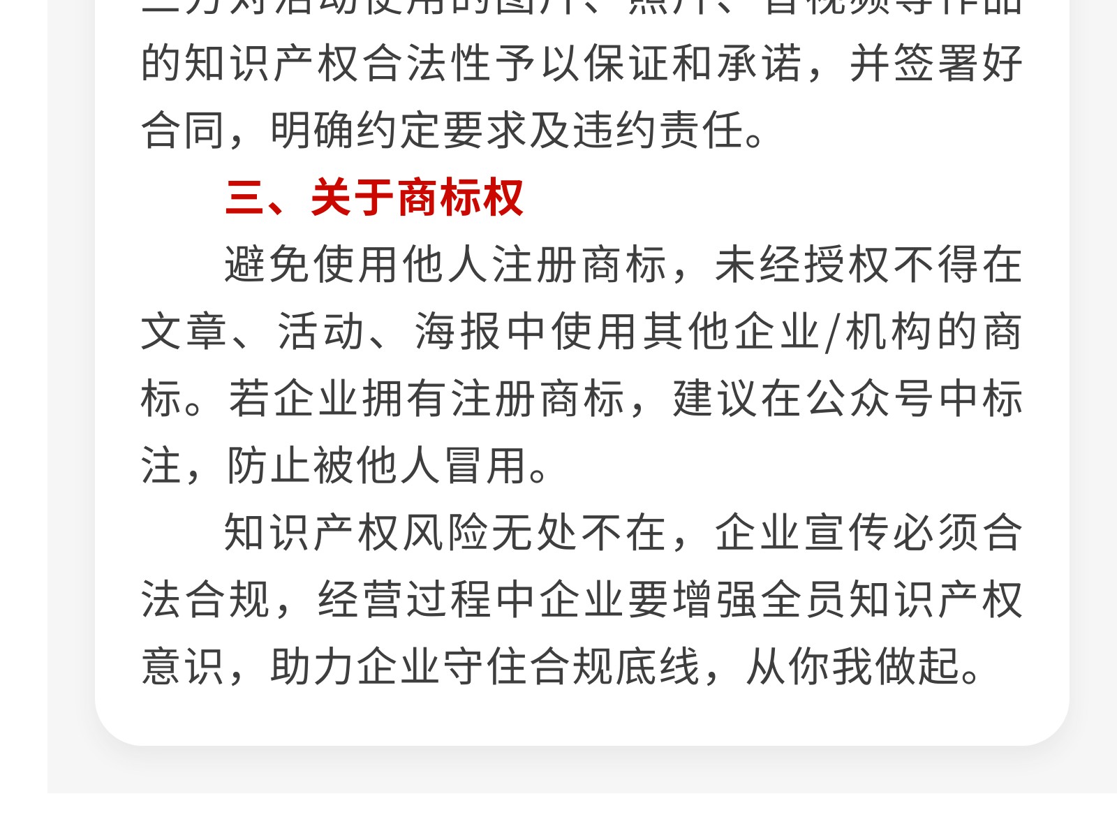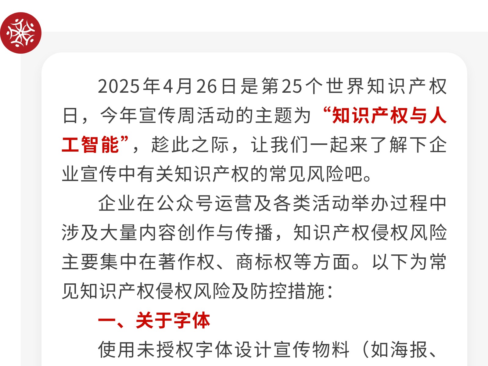 【全國(guó)知識(shí)產(chǎn)權(quán)宣傳周】提高知識(shí)產(chǎn)權(quán)意識(shí),守住企業(yè)合規(guī)底線(xiàn) 發(fā)布時(shí)間:2025年04月28日 16時(shí)來(lái)源:本站原創(chuàng)瀏覽:203 人次