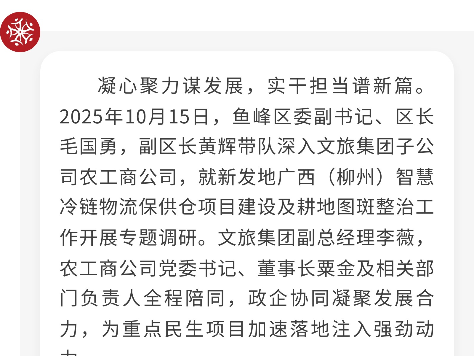 魚峰區(qū)政府主要領(lǐng)導(dǎo)深入調(diào)研指導(dǎo) 文旅集團農(nóng)工商公司全力推進重點民生項目落地 發(fā)布時間:2025年10月16日 09時來源:本站原創(chuàng)瀏覽:104 人次
