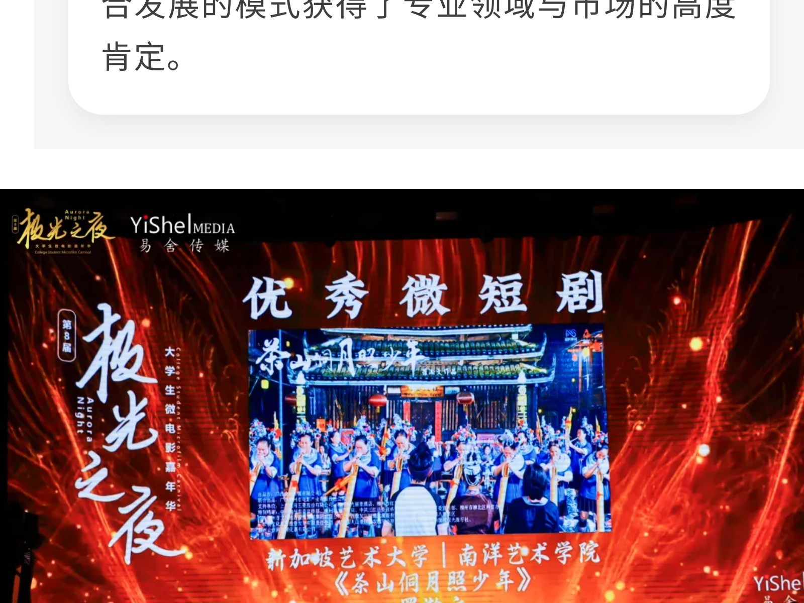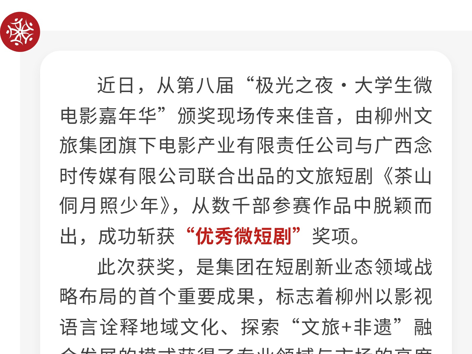 捷報!文旅集團電影公司出品短劇榮膺“極光之夜”優(yōu)秀微短劇獎 發(fā)布時間:2025年10月21日 10時來源:本站原創(chuàng)瀏覽:45 人次