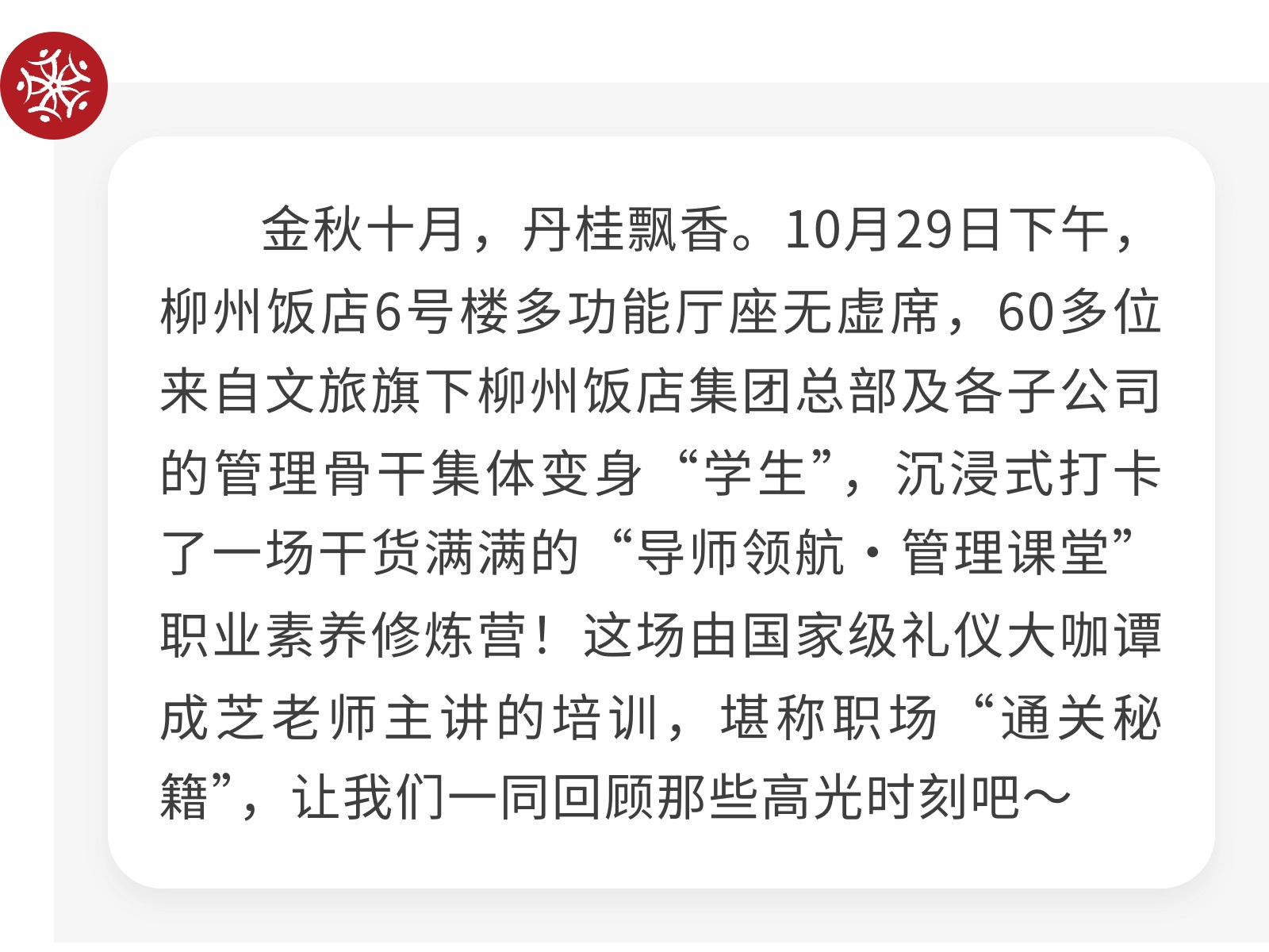 柳州飯店集團“導(dǎo)師領(lǐng)航·管理課堂”職業(yè)素養(yǎng)修煉營圓滿舉辦 發(fā)布時間:2025年10月31日 10時來源:本站原創(chuàng)瀏覽:109 人次