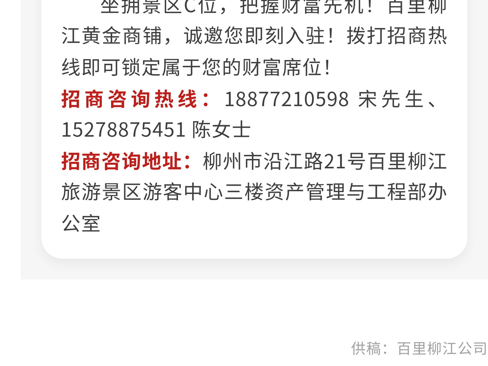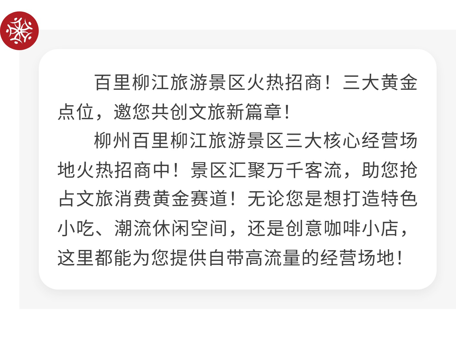 【國企品質(zhì) 誠邀共贏】百里柳江旅游景區(qū)三大黃金點(diǎn)位火熱招商中!邀您共創(chuàng)文旅新篇章! 發(fā)布時(shí)間:2025年10月31日 10時(shí)來源:本站原創(chuàng)瀏覽:107 人次