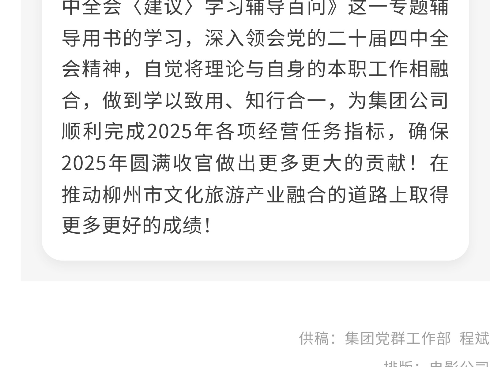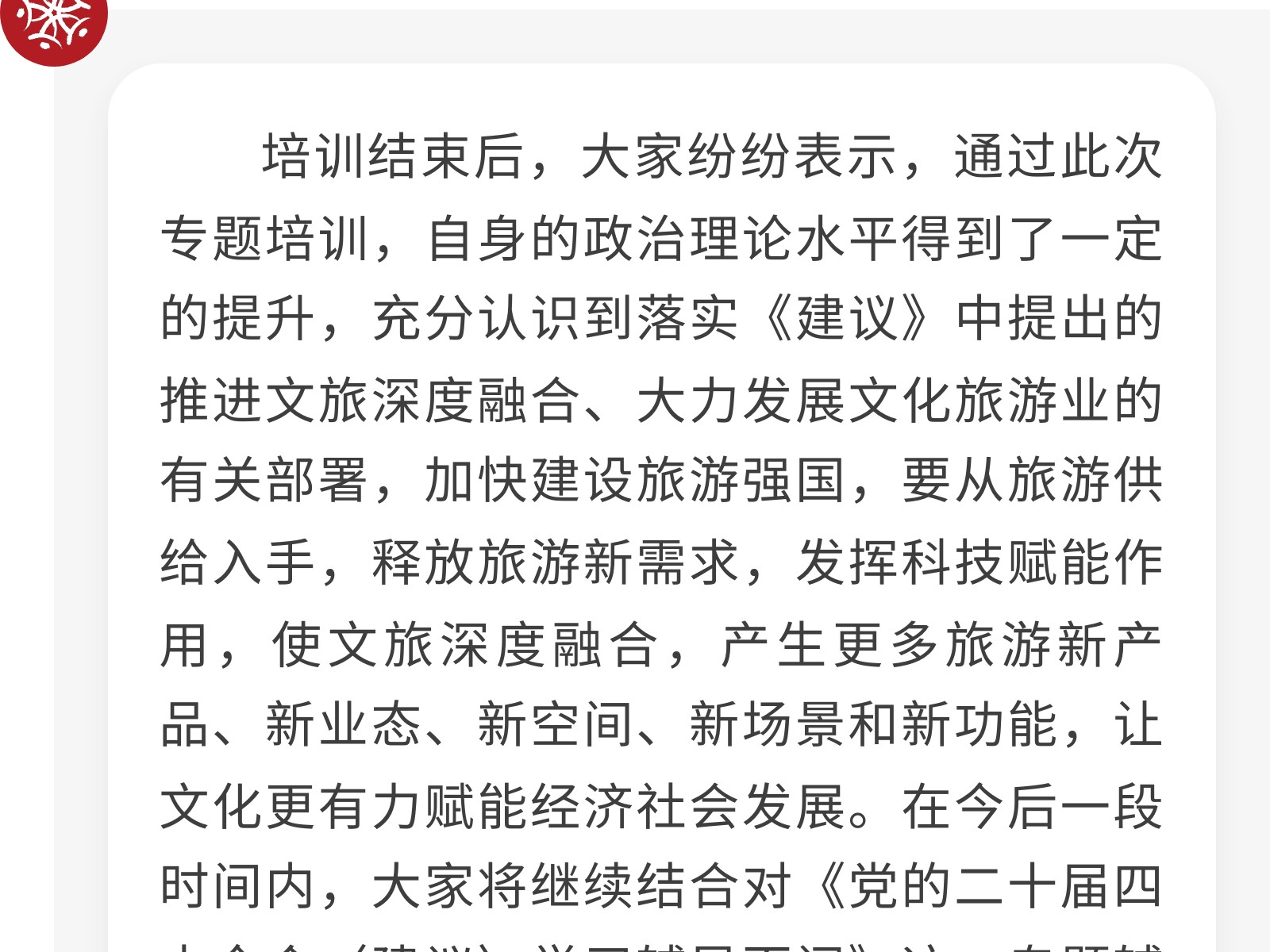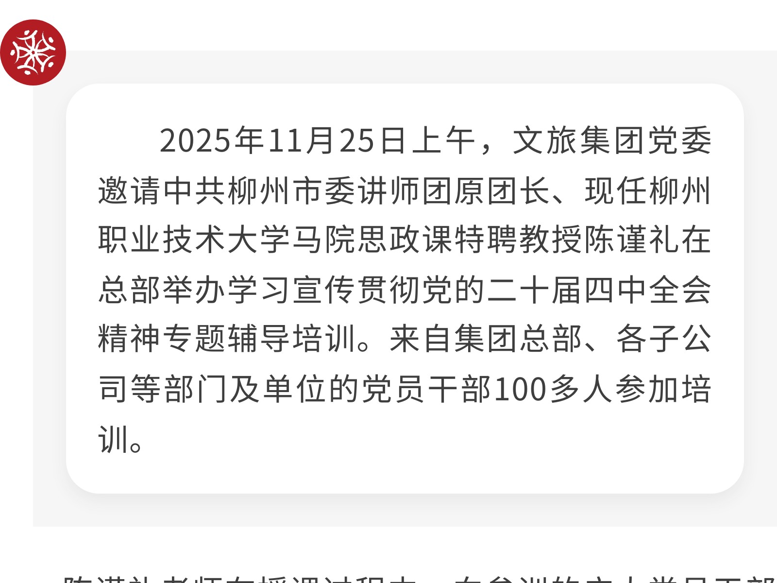 【文旅講堂】文旅集團(tuán)黨委開(kāi)展學(xué)習(xí)宣傳貫徹黨的二十屆四中全會(huì)精神專(zhuān)題輔導(dǎo)培訓(xùn) 發(fā)布時(shí)間:2025年11月25日 16時(shí)來(lái)源:本站原創(chuàng)瀏覽:51 人次