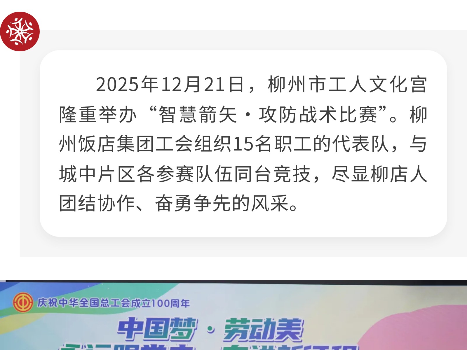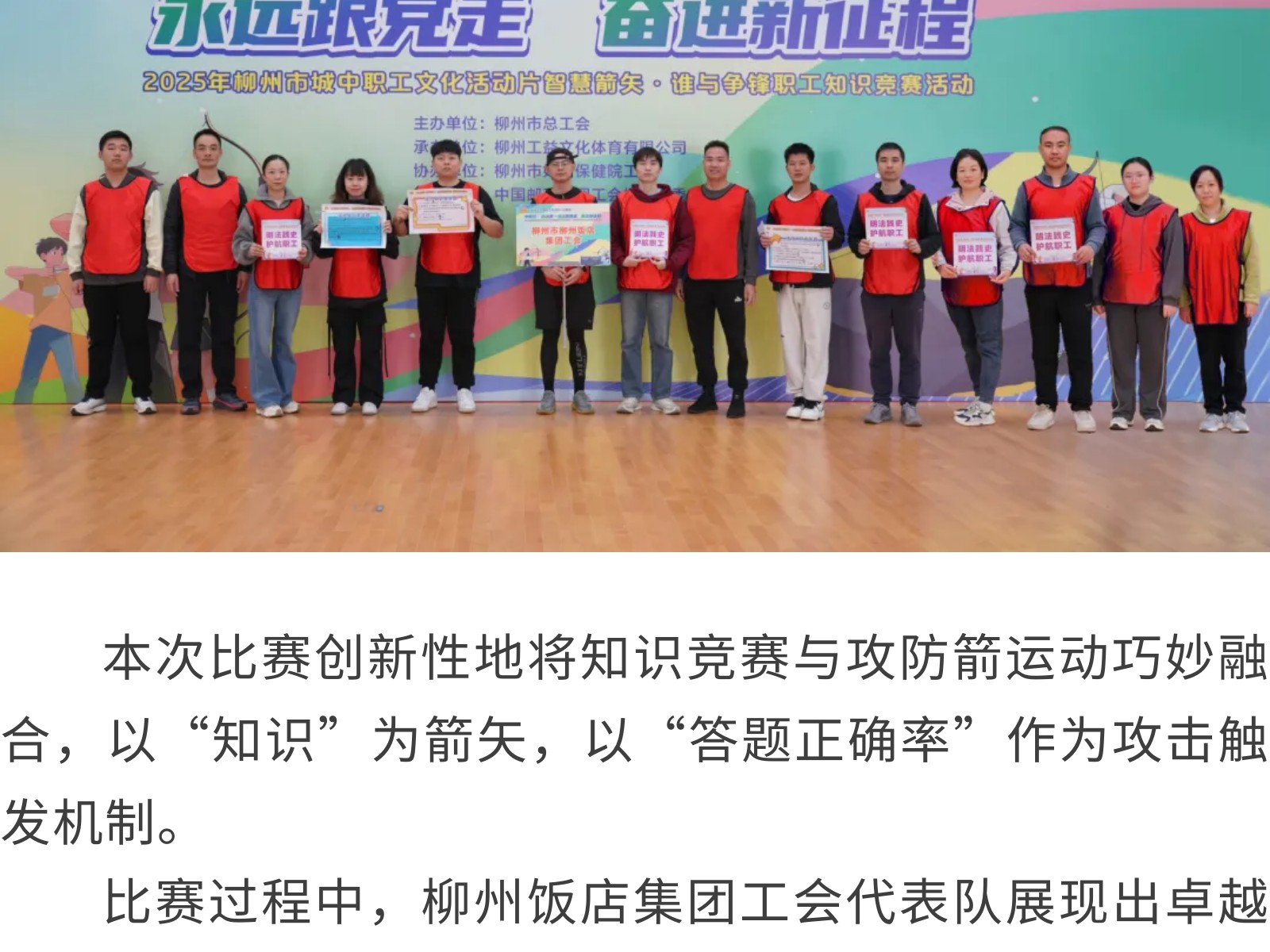 智慧箭矢,誰與爭(zhēng)鋒!——柳州飯店集團(tuán)工會(huì)戰(zhàn)隊(duì)閃耀城中職工文化活動(dòng)賽場(chǎng) 發(fā)布時(shí)間:2025年12月30日 11時(shí)來源:本站原創(chuàng)瀏覽:57 人次