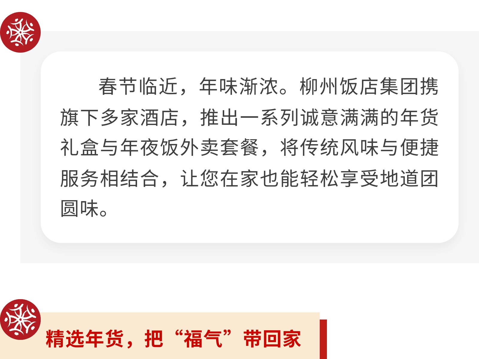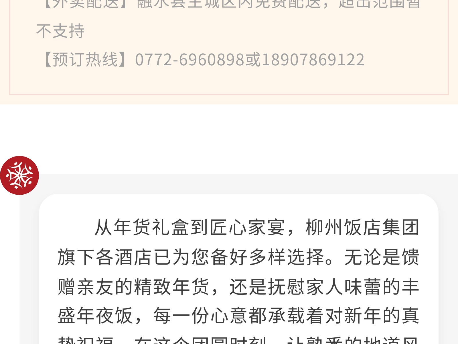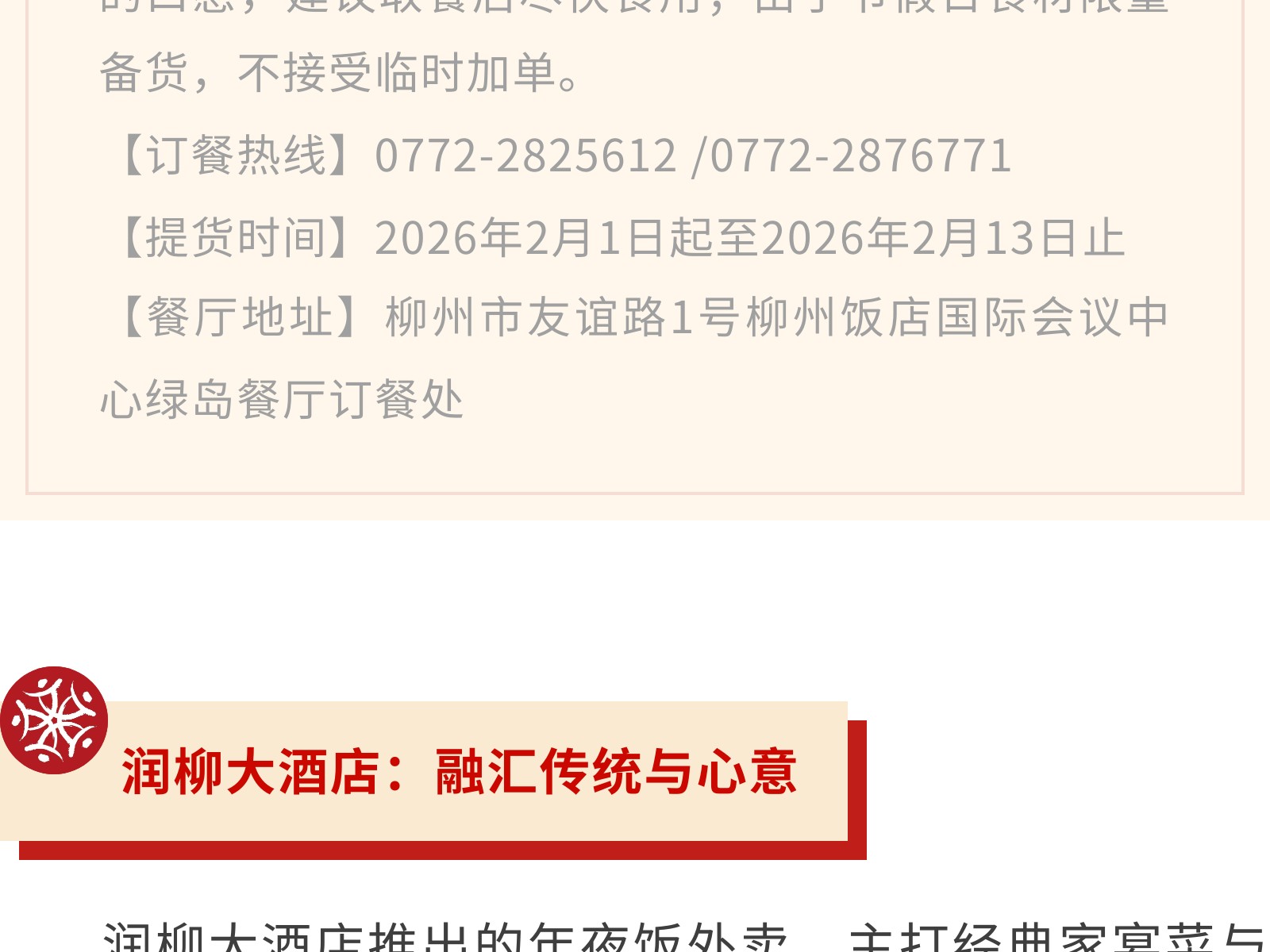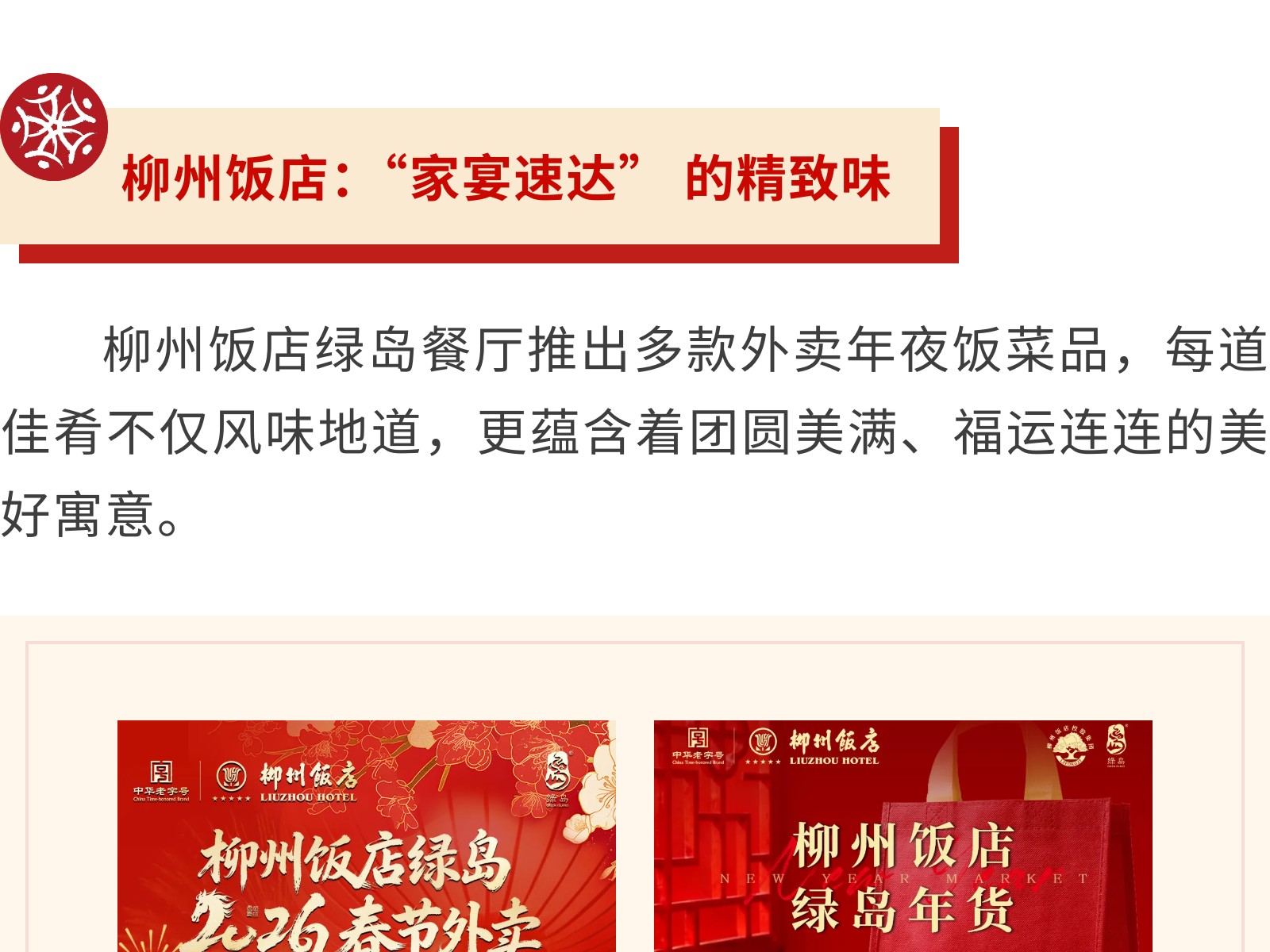 【一口柳州味,滿(mǎn)堂新年紅】文旅集團(tuán)旗下柳州飯店集團(tuán)年貨&年夜飯指南,把團(tuán)圓“打包”回家 發(fā)布時(shí)間:2026年01月16日 14時(shí)來(lái)源:本站原創(chuàng)瀏覽:31 人次