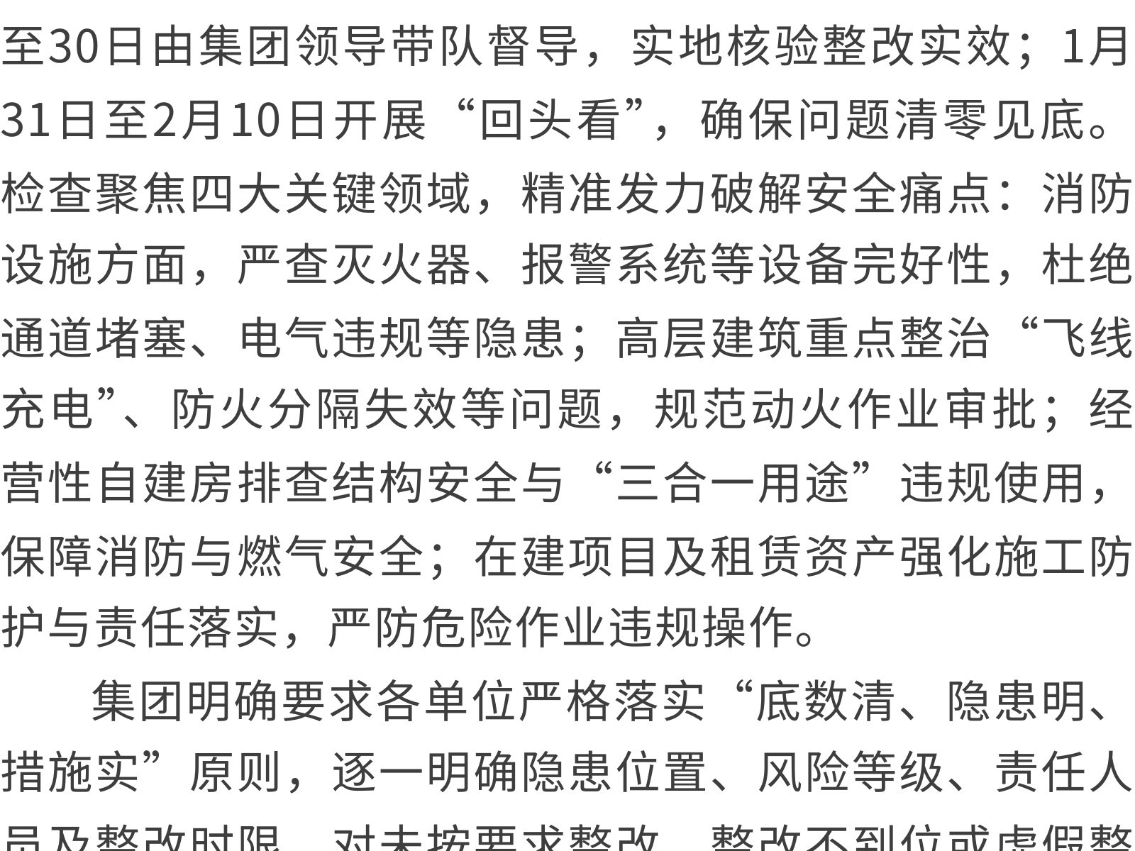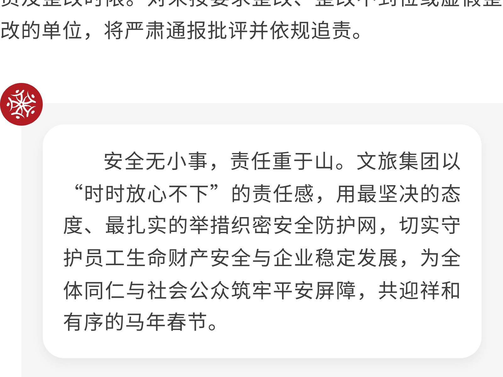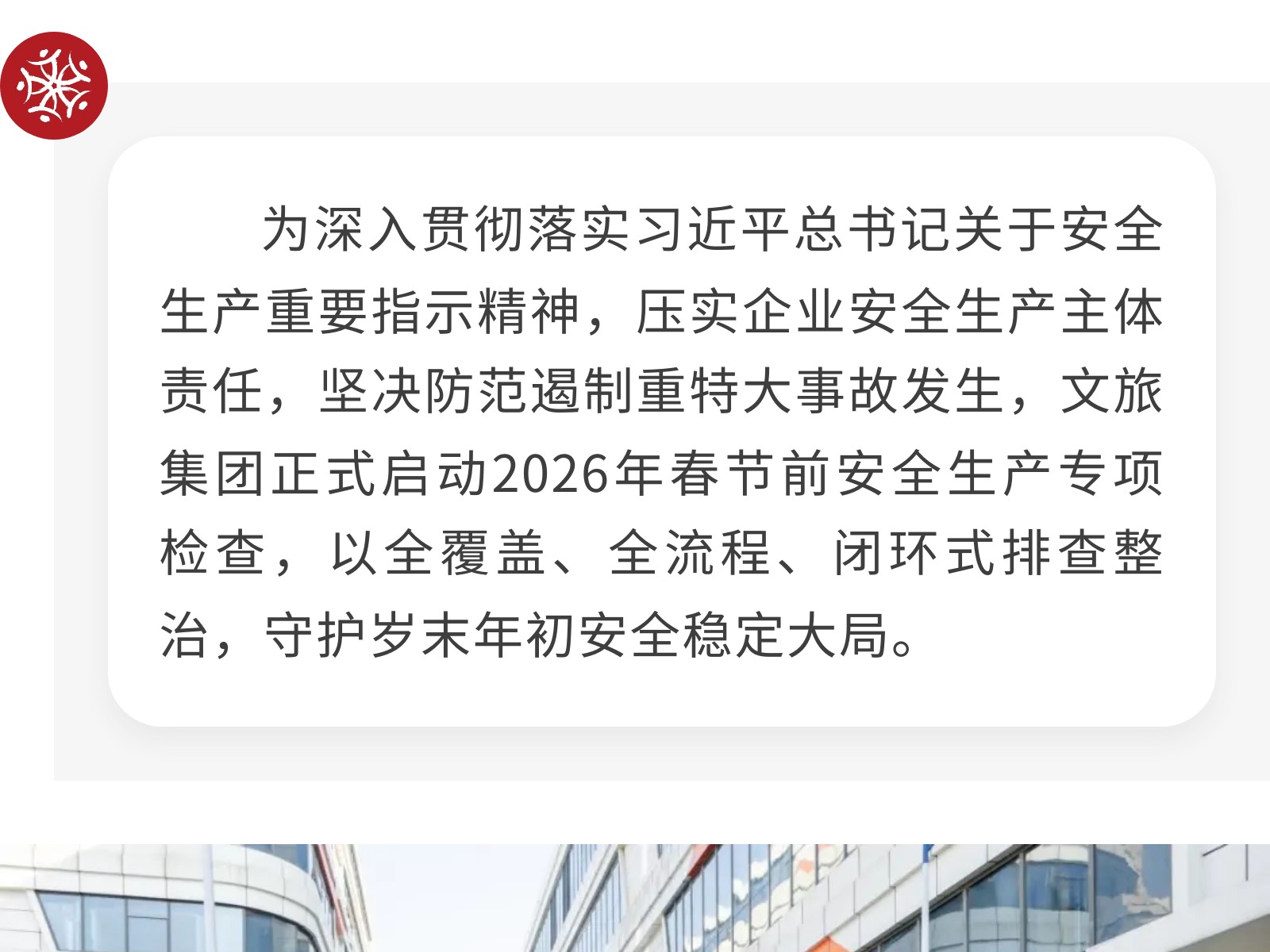 筑牢安全防線 護航馬年新春——文旅集團啟動2026年春節(jié)前安全生產(chǎn)專項檢查 發(fā)布時間:2026年02月03日 15時來源:本站原創(chuàng)瀏覽:44 人次