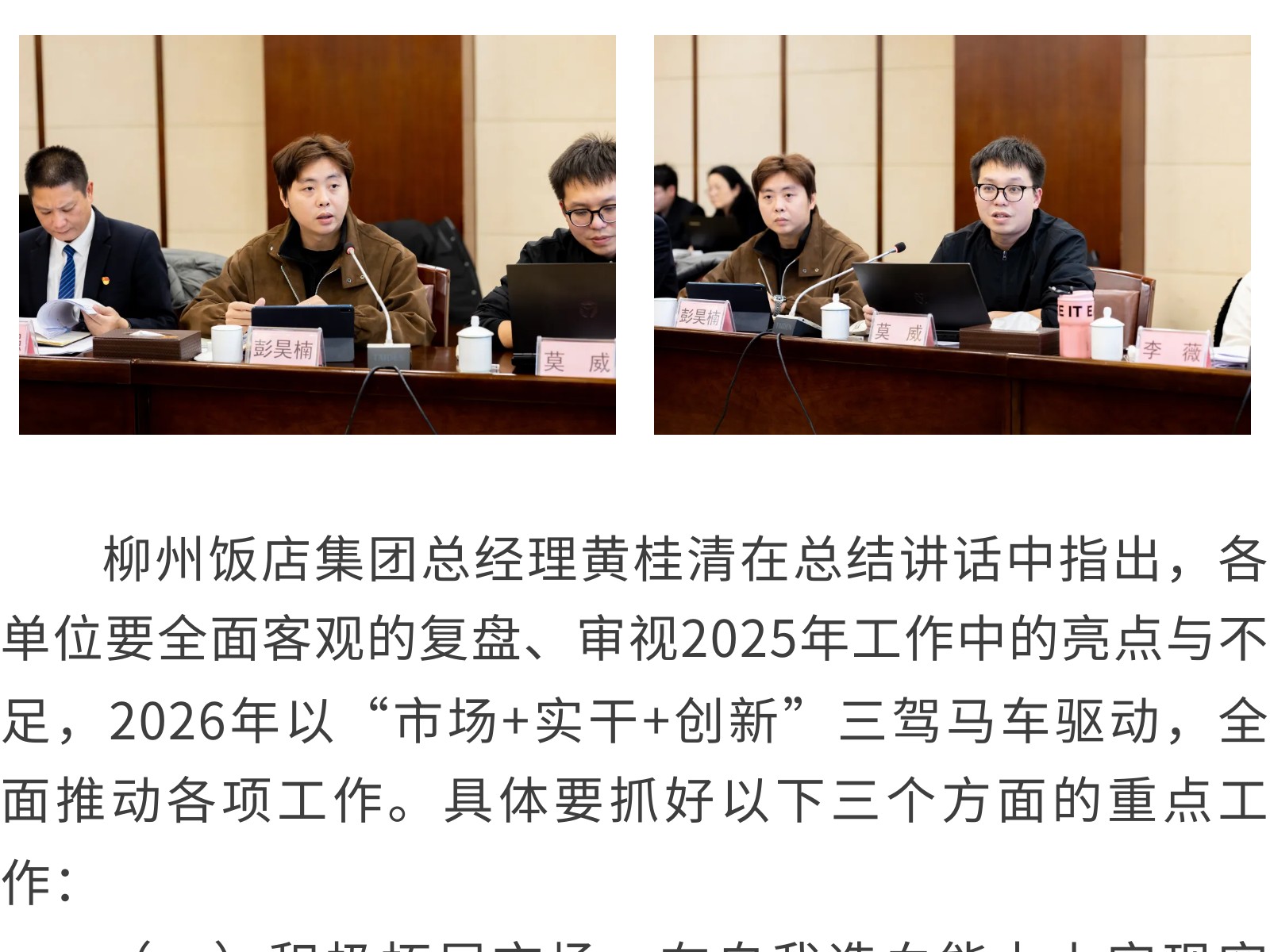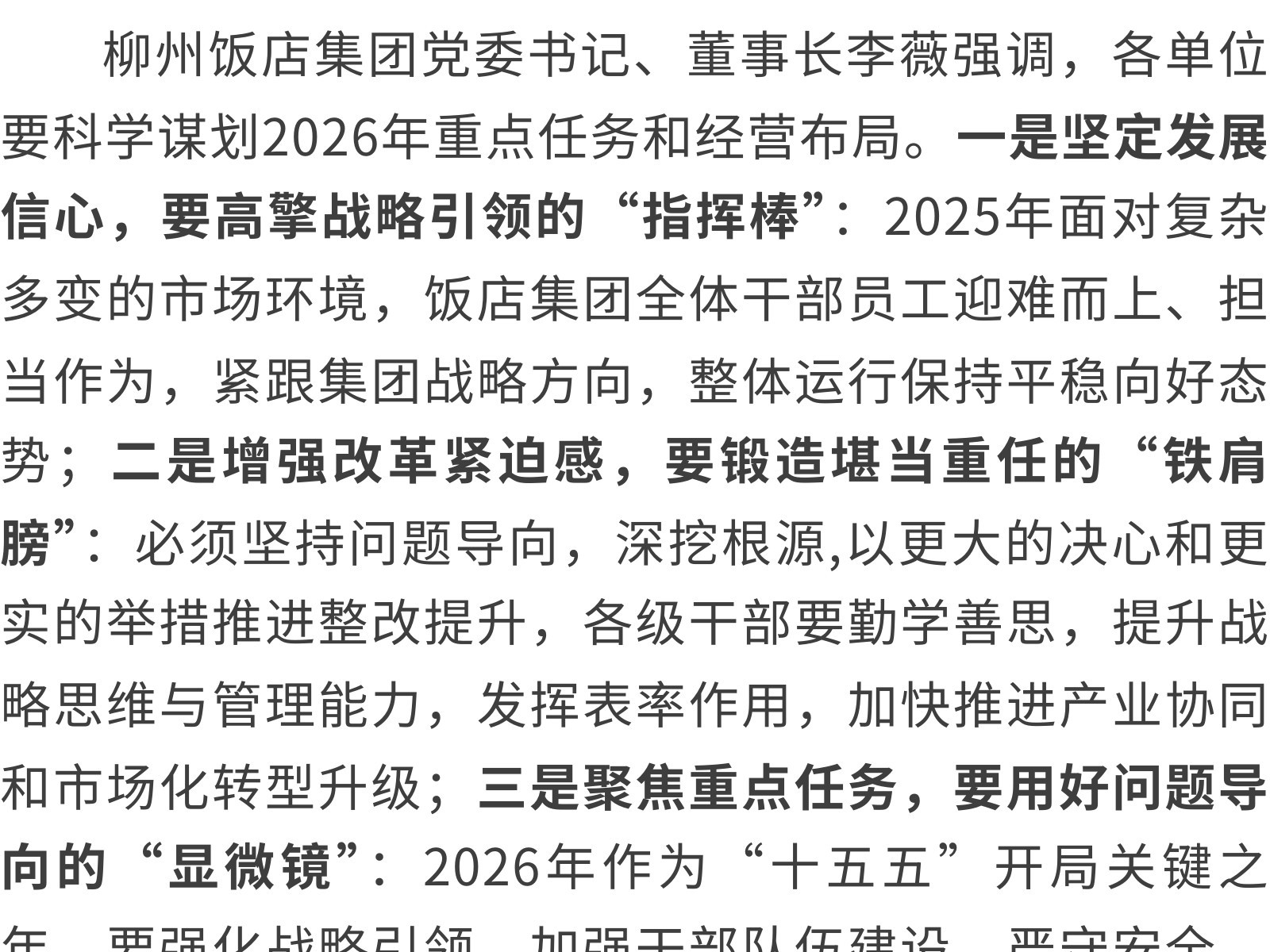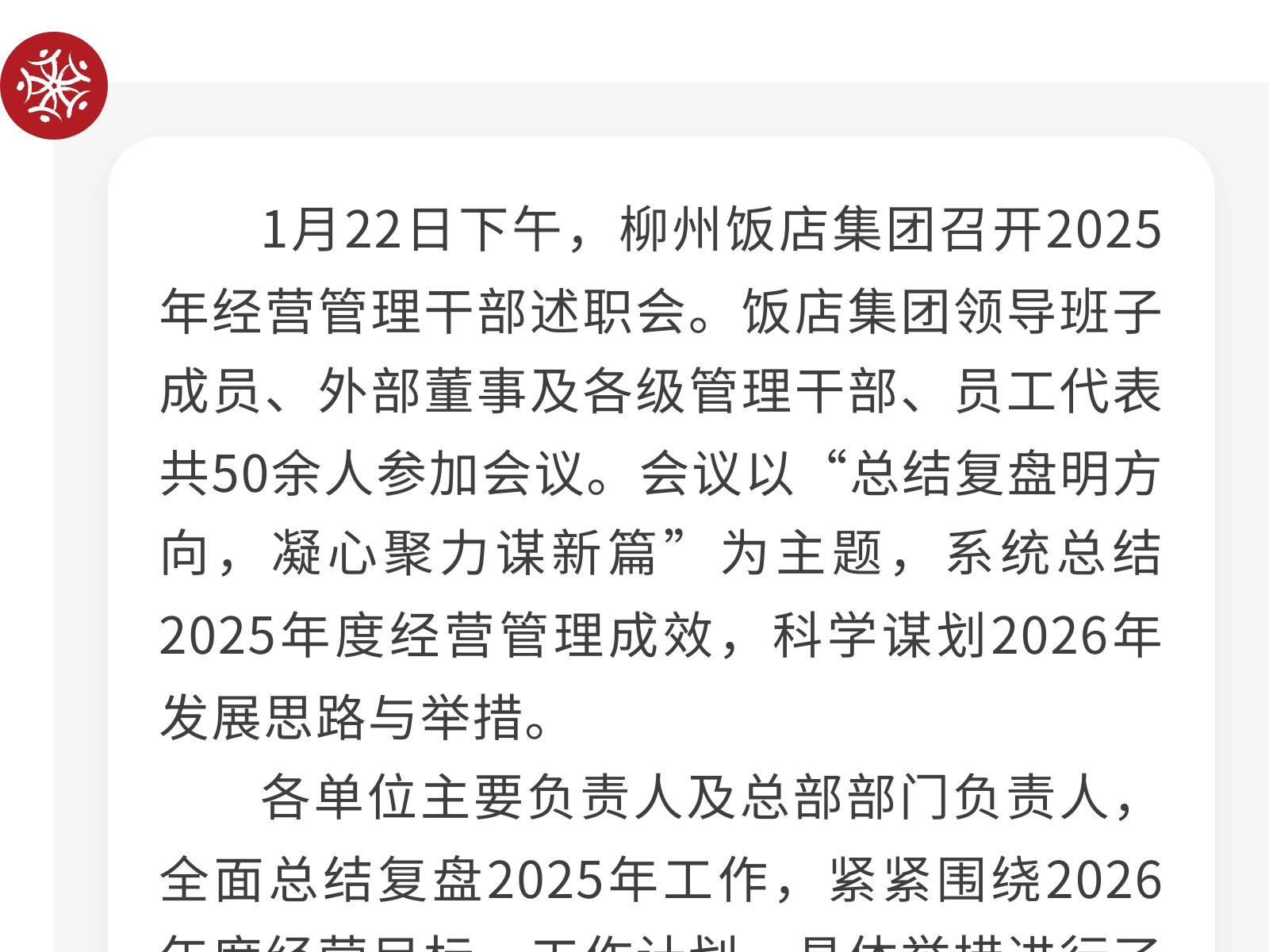 述職亮答卷,乘勢開新局——柳州飯店集團召開2025年經營管理干部述職會 發(fā)布時間:2026年01月29日 10時來源:本站原創(chuàng)瀏覽:38 人次