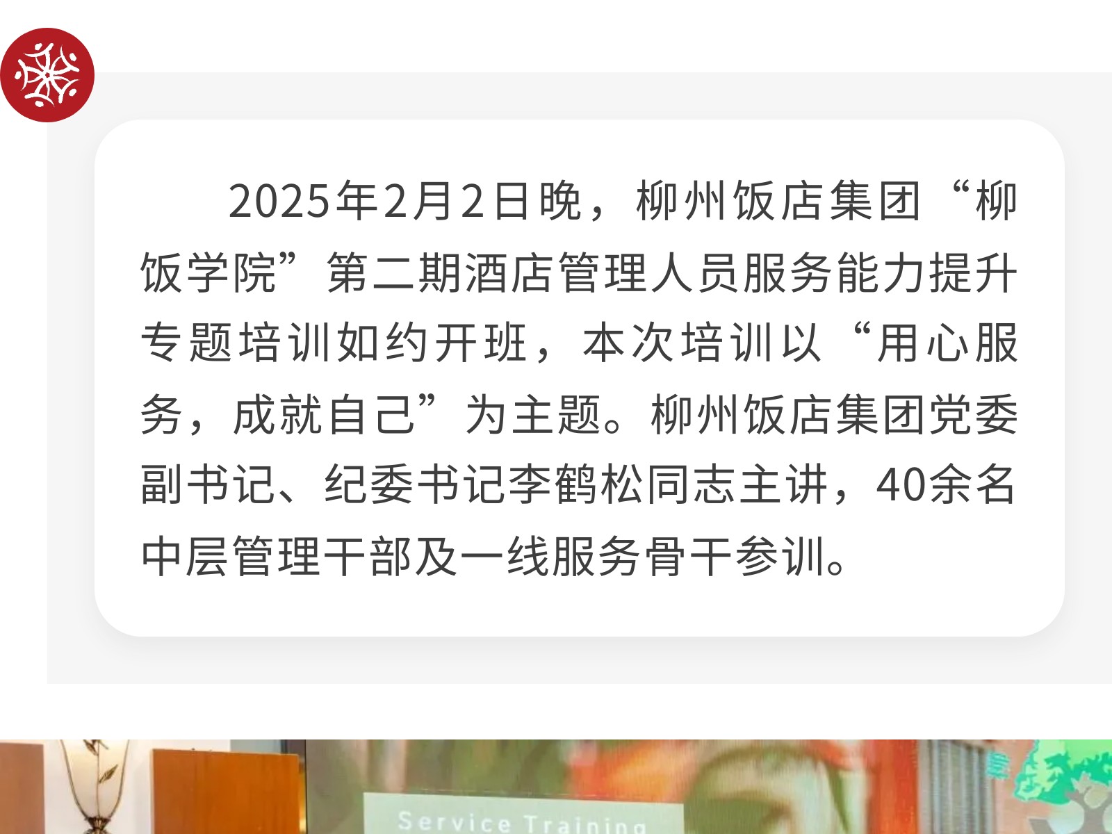 精耕服務(wù)啟新程,聚力向善謀突破——柳州飯店集團(tuán)開(kāi)展“用心服務(wù),成就自己”酒店管理人員服務(wù)能力提升專題培訓(xùn) 發(fā)布時(shí)間:2026年02月13日 13時(shí)來(lái)源:本站原創(chuàng)瀏覽:16 人次