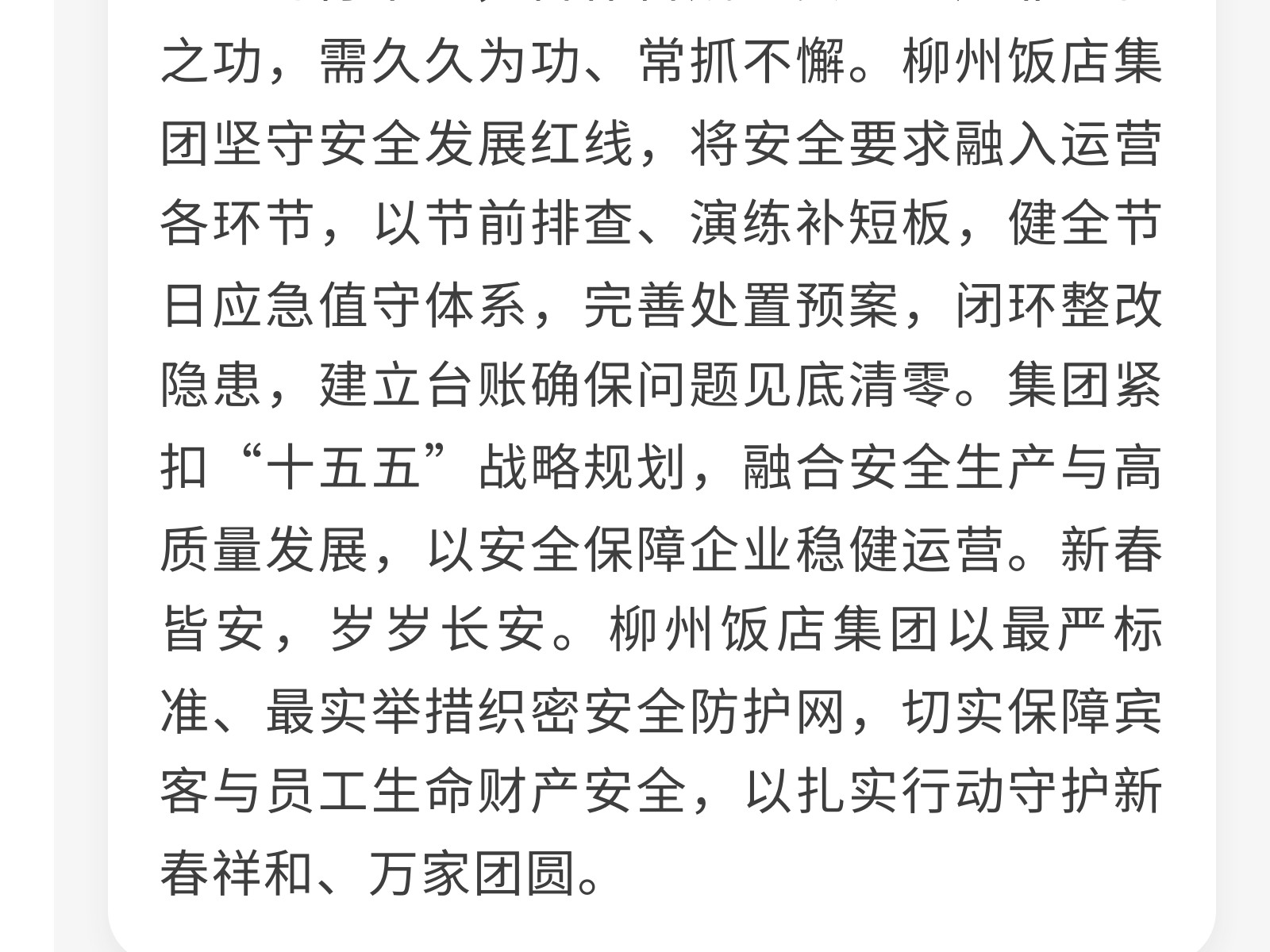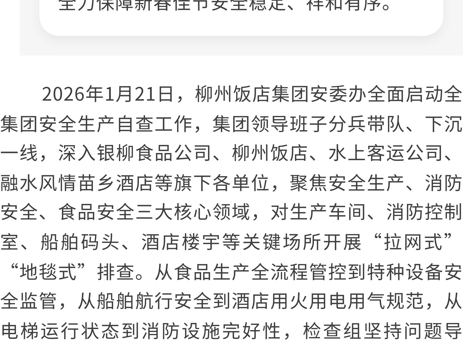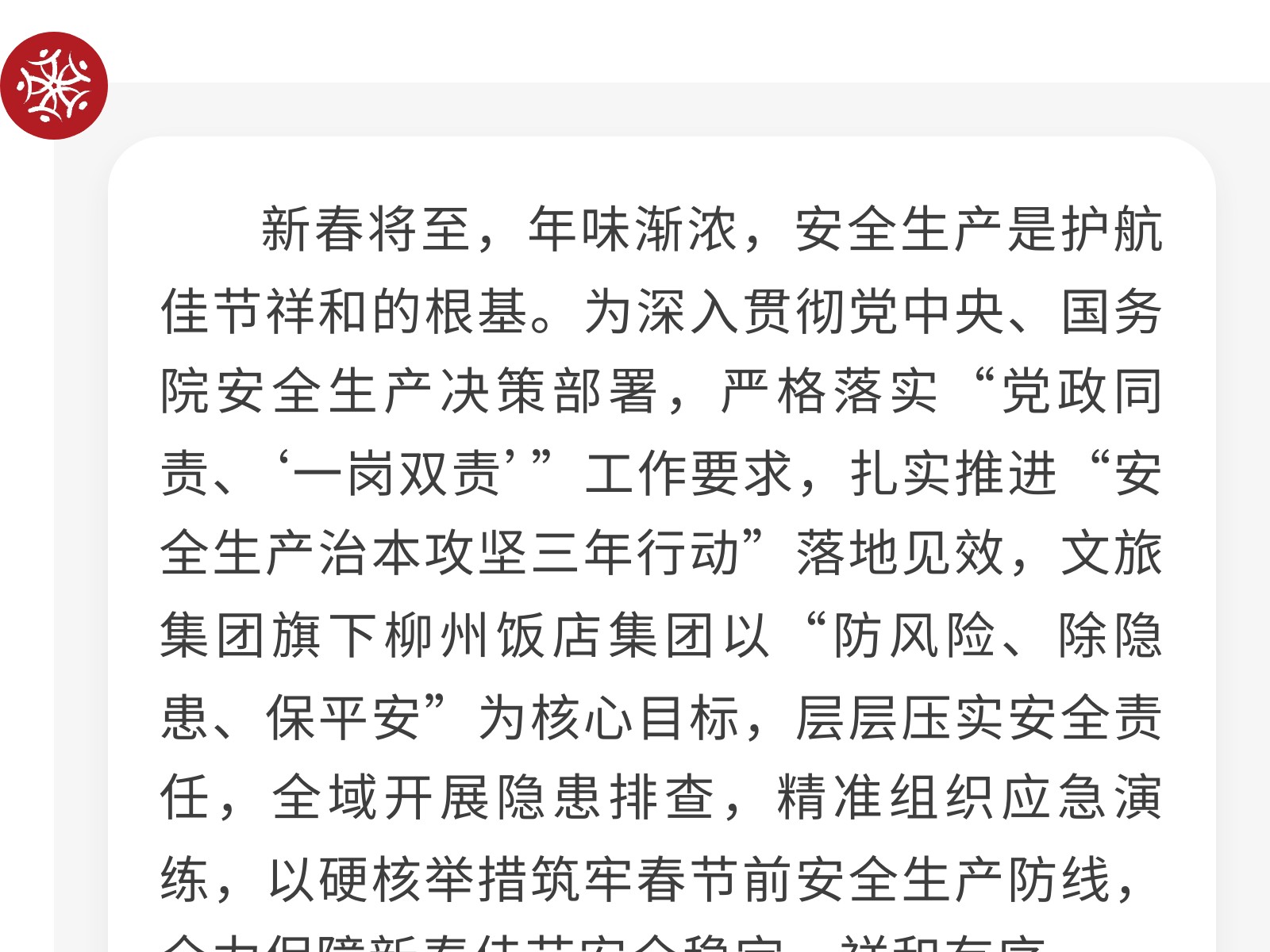 織密安全防護(hù)網(wǎng) 護(hù)航新春平安年——柳州飯店集團(tuán)開展春節(jié)前安全生產(chǎn)系列活動 發(fā)布時間:2026年02月13日 13時來源:本站原創(chuàng)瀏覽:14 人次