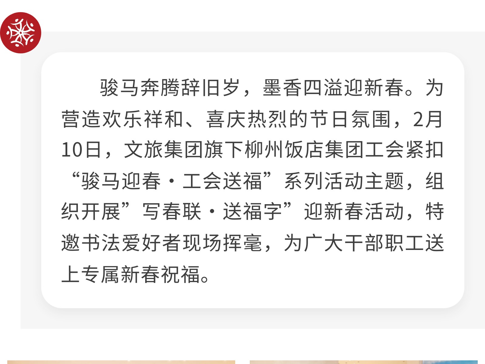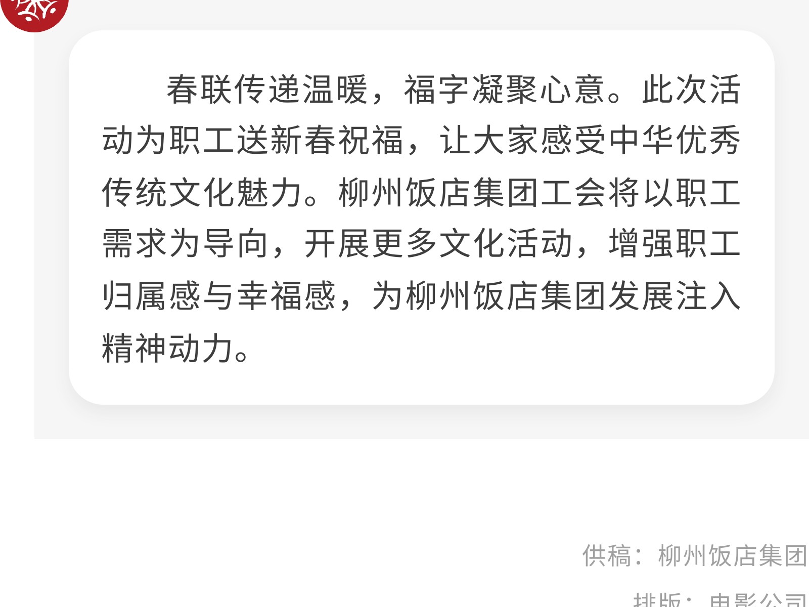 筆墨迎新春 福聯(lián)暖人心——柳州飯店集團(tuán)開展“寫春聯(lián)·送福字”迎新春活動 發(fā)布時(shí)間:2026年02月13日 13時(shí)來源:本站原創(chuàng)瀏覽:15 人次